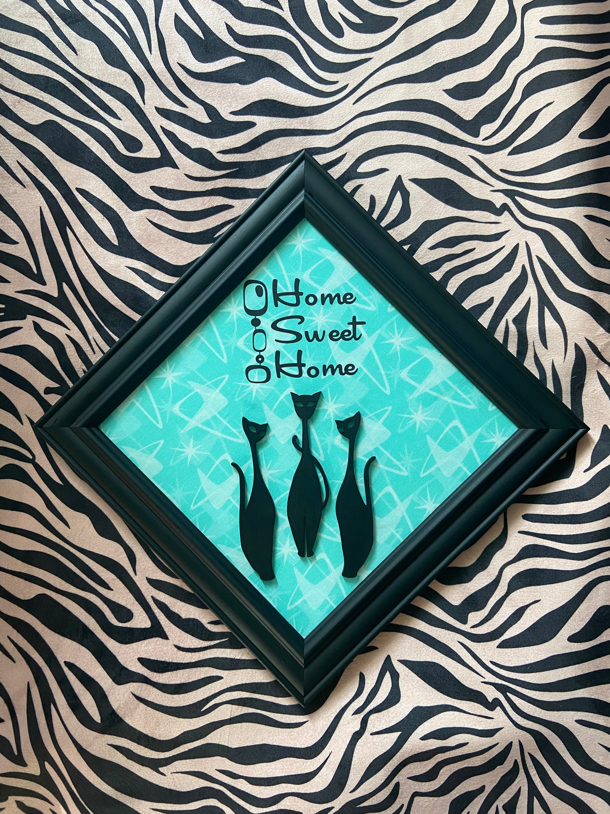 Laser cut Baltic Birch trio of Sexton Cats. Ultra matte black finish. Backed onto atomic inspired, aqua cotton cloth and set into a repurposed vintage frame. Ultra matte black finish.